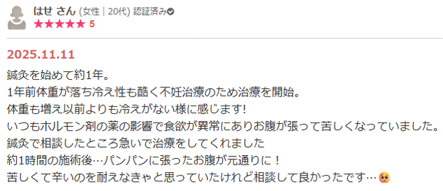 お腹の張りやガスの滞りは、身体全体にさまざまな影響を及ぼしますので、改めてトータル的な鍼灸ケアの大切さを感じました。
